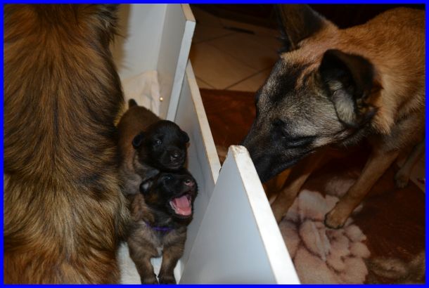Akela durfte das erste Mal ganz nah an die Wurfkiste und die Babys! Nun dauert es nicht mehr lange und alle Hunde dürfen die Babys bestaunen!