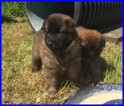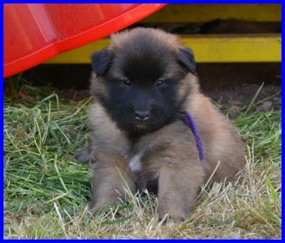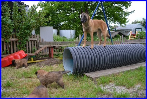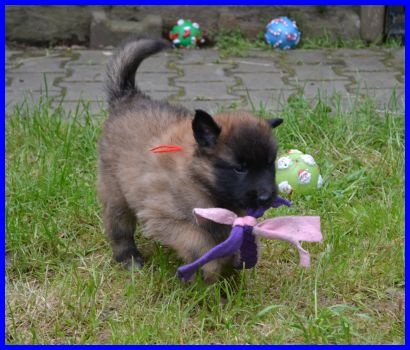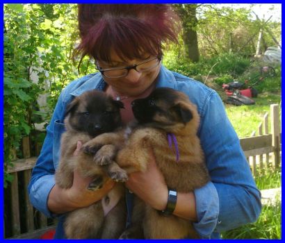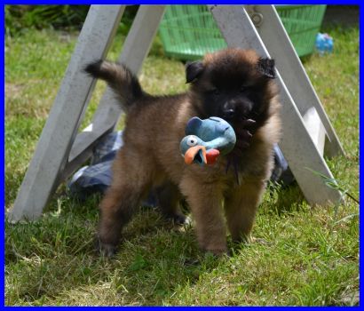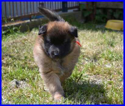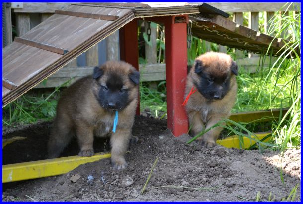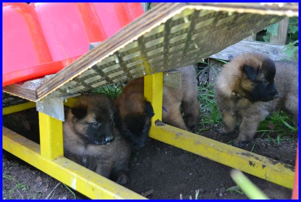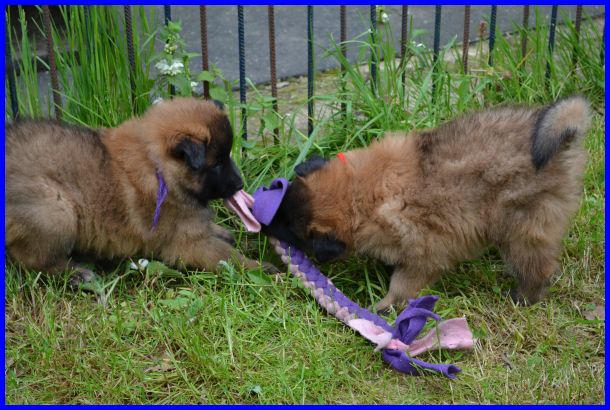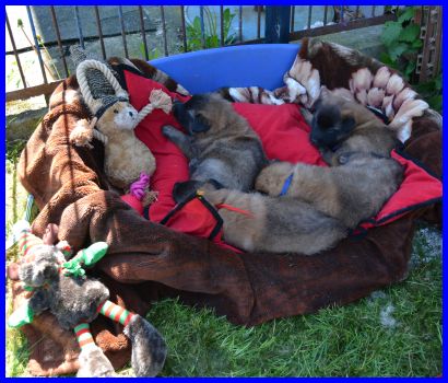 Die nachfolgenden Fotos zeigen die Babys in ihrer Entwicklung von der dritten bis zur fünften Woche. Aus den kleinen Kuschelbabys sind mittlerweile richtige Riesenbabys geworden! Sie wachsen und gedeihen prächtig! Sie sehen nicht nur aus wie richtige Hunde, sie verhalten sich auch so. Sie bellen und knurren wie die Großen, verteidigen eroberte Spielzeuge, kämpfen um die beste Zapfstelle bei Mama oder den beliebtesten Schlafplatz. Alles Neue wird sofort untersucht und nach Möglichkeit in Sicherheit gebracht. Am Tag sind sie immer im Garten, erobern in ihrem Welpenkindergarten jeden Tag eine neue Welt. Am Abend sind sie dann in ihrem Welpenzimmer oder bei uns in der Stube und lauschen den Geräuschen des täglichen Lebens im Haus, ob das nun der Fernseher, ein Staubsauger oder einfach nur Geschirr klappern ist!