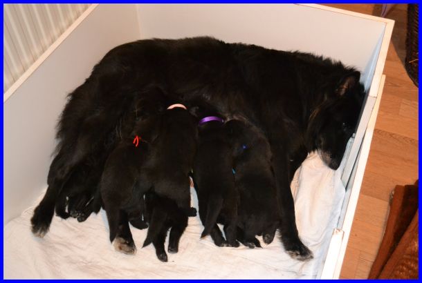Zurück im Welpenzimmer gibts in der Wurfkiste eine Riesenportion Milch. YooPee ist zufrieden, ihre Babys sind wieder da, wo sie eigentlich hingehören, in ihrer Wurfkiste!