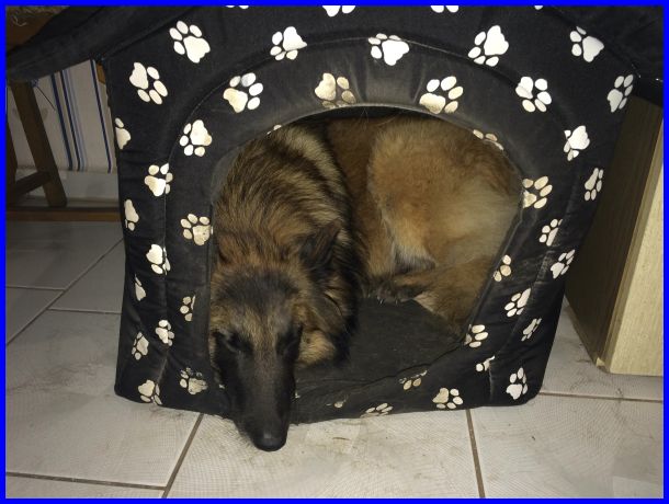 Nachdem ich ihre Höhle unter den Pflanzsteinen mehrmals zerstört hatte, beschloss Farouche ihre Babys in dieser Stoffhütte zu bekommen. In die Wurfkiste wollte sie nicht!
