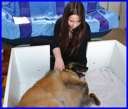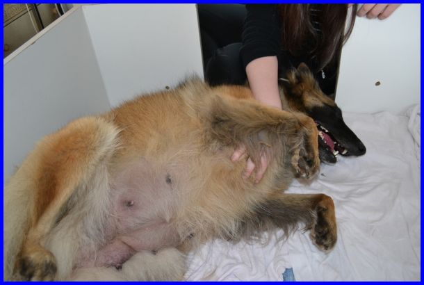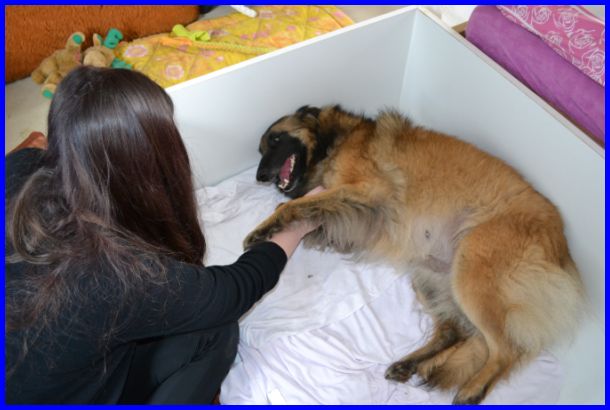 Die Vorwehen dauerten von 14 Uhr bis 16:50 Uhr, dann kam der erste Welpe auf die Welt. In dieser Zeit wurde sie von Vanessa und mir mit Streicheleinheiten verwöhnt! Wie man sieht, genießt es Faroche total!
