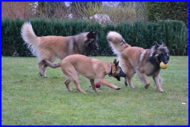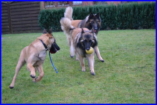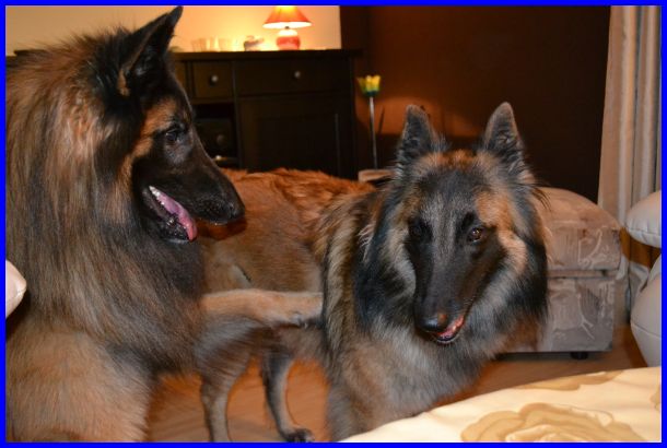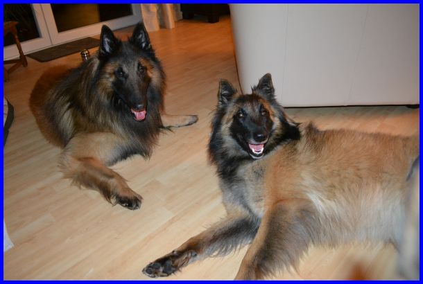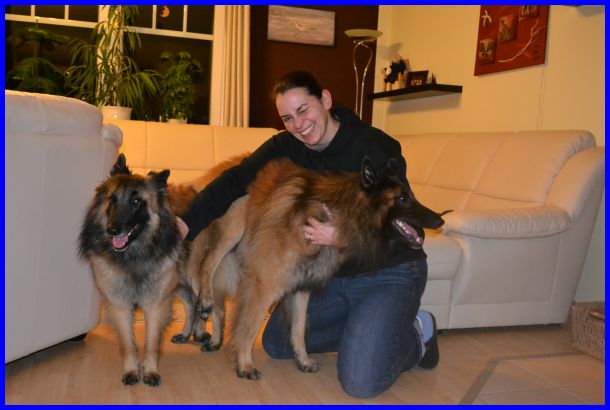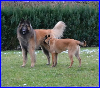 Wieso habe ich mich für Digger entschieden? Digger ist ein sehr typvoller, wunderschöner Tervuerenrüde, der in hohem Maße dem Standard entspricht, ausgeglichen mit einem sehr selbstsicheren Wesen, freundlich zu Mensch und Tier, mein Malikind Akela war total verliebt in ihn! Farouche entspricht ebenfalls in hohem Maße dem Standard, sie ist eine bildschöne und elegante Hündin, Tochter meiner Abigail und damit Enkelin meiner Shiva, durch die sie einige Groenendael in ihren Ahnen hat. Farouche hat auch die Titel Deutscher Champion VDH und Deutscher Jugendchampion VDH.