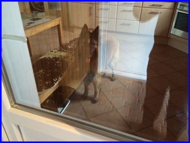 Wir haben die ganzen Tage bei Kathrin gewohnt, danke noch mal für Deine Gastfreundschaft, es war eine sehr schöne Zeit bei Euch! Früh am Morgen, Farouche jammert, will zu Digger, und er sucht sein Mädel im Garten!