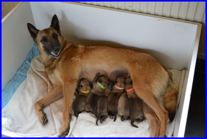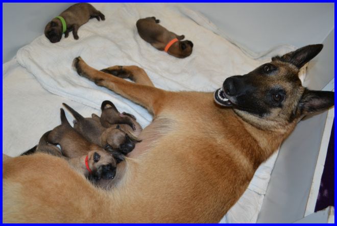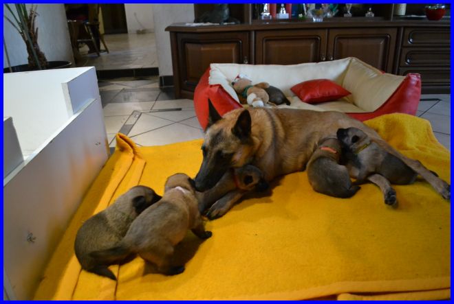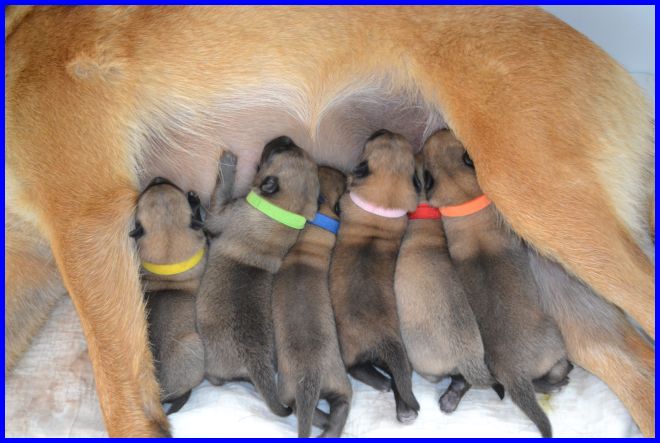 Nun müssen die Welpen sich schon etwas anstrengen um an die Milch zu gelangen, Akela verlangt jetzt vollen Körpereinsatz :-)