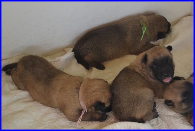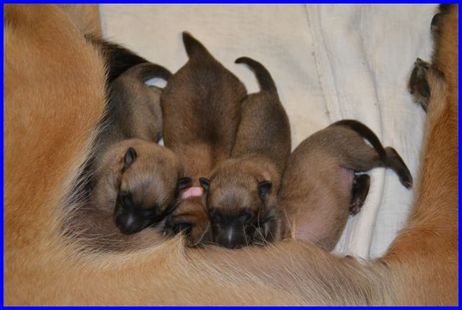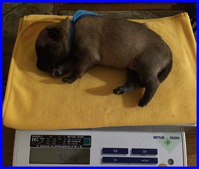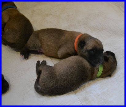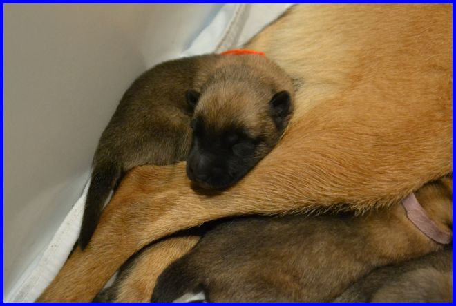 Die ersten Fotos sind vom 19.05.2018 da sind die Welpen erst vier Tage alt! Akela kümmert sich vorbildlich um ihre Babys. Mit 14 Tagen haben außer Rüde Orange alle ihr Geburtsgewicht verdreifacht, das ist unglaublich!