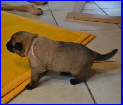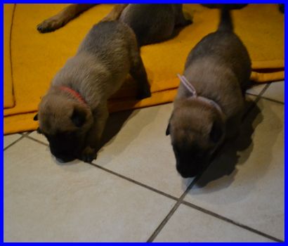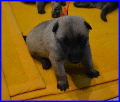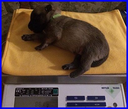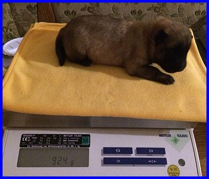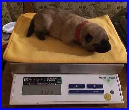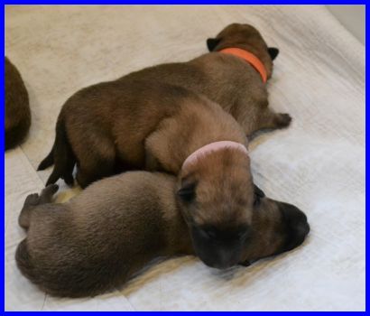 Die Entwicklung in den ersten 14 Tagen ist enorm. Aus blinden und tauben Saugwelpen haben sich kleine Hunde entwickelt, die langsam die ersten tapsigen Schritte versuchen. Einen riesen Schritt in der Entwicklung gab es vom 10. bis zum 14. Lebenstag der Welpen. Mit 9 Tagen sind die Welpen noch recht unbeholfen, die Augen und auch die Ohren sind noch geschlossen, die kleine Welt besteht zum größten Teil immer noch aus trinken und schlafen. Schon zwei Tage später versuchen die Babys sich aufzusetzen, auch wenn es nur ganz kurz und ziemlich wakelig ist. Mit 14 Tagen sind bei allen Welpen die Augen geöffnet, sie nehmen eindeutig Schatten wahr, reagieren auf Bewegungen vor ihren Augen. Sie versuchen die ersten richtigen Schritte, fallen natürlich nach zwei bis drei Schritten auf die kleinen Nasen, aber sie versuchen ihr Glück immer wieder aufs Neue! Die Babys untersuchen schon recht neugierig ihre Geschwister, versuchen mit dem kleinen Mäulchen einander festzuhalten. Ab und zu kann man schon kleine Knurrlaute aus der Wurfkiste hören! Sie sind jetzt auch in der Lage sich selbstständig zu lösen.