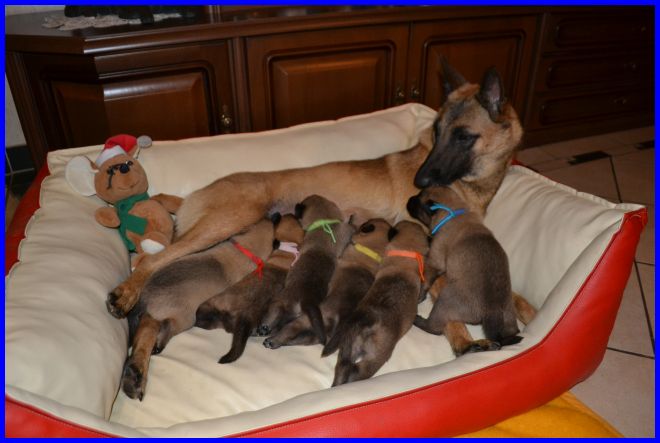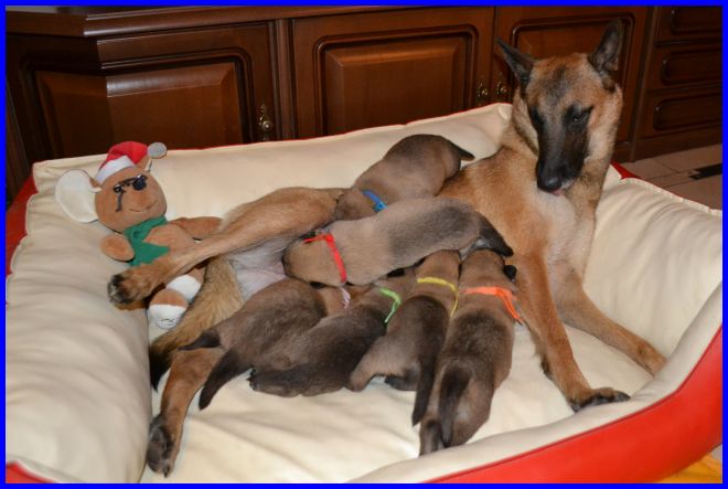 Juilette hat sich heimlich zu den Babys geschlichen! Sie liebt Babys über alles, aber Akela erlaubt es ihr noch nicht. Die Welpen sind hier schon 13 Tage alt, können sehen, bisschen laufen, sich selber lösen. Die Entwicklung ist rasant. |