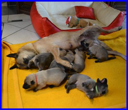 Akela schläft mit ihren Babys und meine Rudelchefin YooPee passt auf sie und die Knirpse auf. Kein anderer Hund darf jetzt in die Stube.