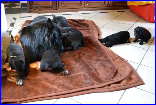 YooPee bleibt natürlich die ganze Zeit bei ihren Welpen, passt sehr gut auf.