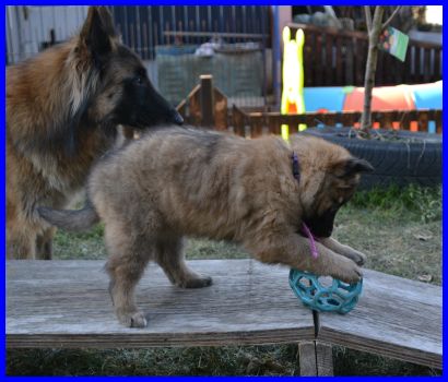 Natürlich hat Marion wieder jede Menge Geschenke für die Babys mitgebracht, noch mal ganz lieben Dank dafür. Das Highlight, die Mutprobe, war die Schlange, die Marion am Strick durch den Welpengarten gezogen hat. Akela wollte das Teil sofort haben, war aber für die Babys, da ist Marion konsequent :-) |