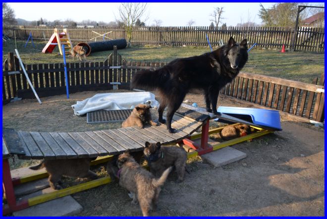 Was für ein schönes Bild. Drei Generationen - Links außen Farouche (5Jahre), in der Mitte ihre Oma Shiva (15 Jahre) und im Welpengarten ihre Mama Abigail (12 Jahre) Rechts außen meine Malidame Avanti . sie ist auch schon 11 Jahre alt.