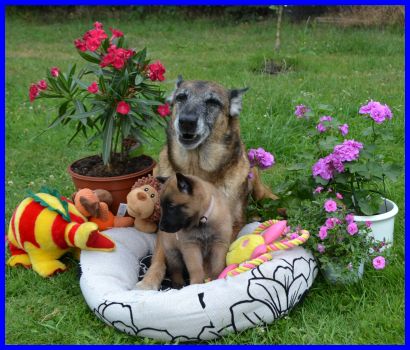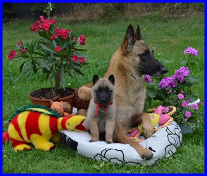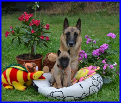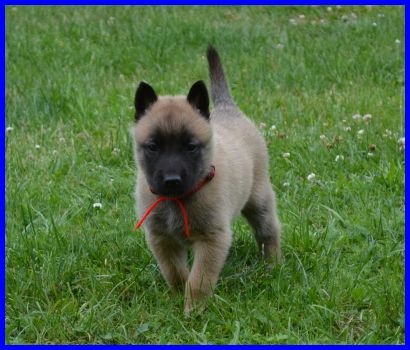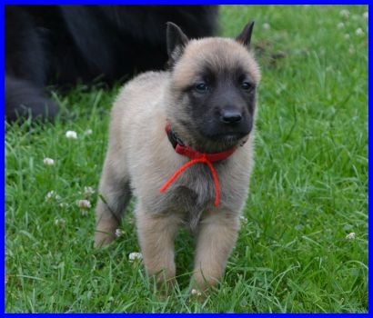 Mr. Gelb, DAS Fliegengewicht! Er ist mit 2060g der leichteste Welpe! Er ist ein ganz cleveres Bürschlein, hat als erster Mamas Futternapf entdeckt und auch sofort probiert :-) Neugierig und mutig marschiert er alleine los, hat null Repekt vor meiner Tervuerenhündin Farouche, siehe drittes Bild :-) |