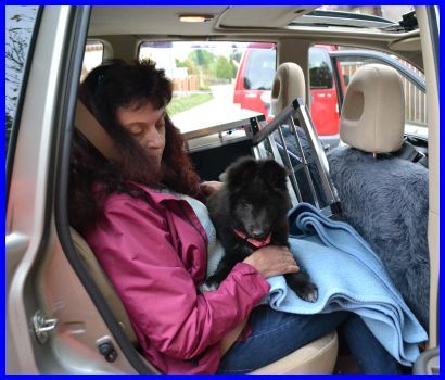 Greta kannte ihr neues Frauchen schon von ihrem Besuch vor vier Wochen, liegt total entspannt auf dem Arm von ihrem neuen Frauchen. |
