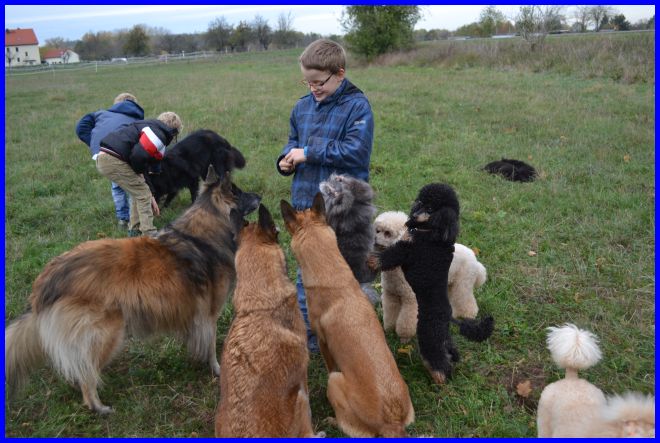 Dennis, der Hundeflüsterer!!! Er konnte sich super gut auf die Hunde einstellen, hat unsere Pudeldame Sydney mit ganz viel Einfühlungsvermögen umgarnt und mit ihr gespielt. Mit meiner Malihündin Akela hat er sogar kleine Unterordnungsübungen gemacht, das sah richtig gut aus. |
