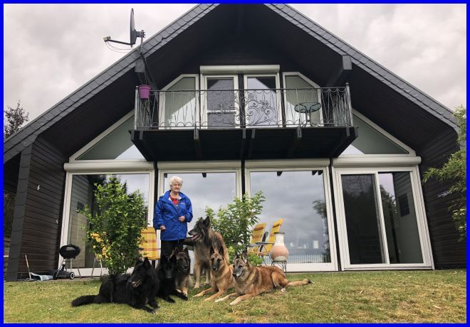 Der Garten war komplett eingezäunt und richtig groß. Hier schauen meine Damen gerade REH-TV! Auf der Wiese standen jeden Morgen und Abend Rehe, auch mehrere Hasen frühstückten dort, es wurde nie langweilig. Das Foto ist vom 07.07.2019 der 35.Tag der Tragezeit, Akela schaut netterweise zu mir in die Kamera!