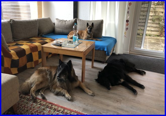Wir hatten mega viel Platz. Akela thront auf dem Sofa, das natürlich mit unseren Decken abgedeckt war! Davor liegt meine Tervuerenhündin Abigail, die im Oktober 14 Jahre alt wird, und meine Groenendaelhündin YooPee, die im Januar 9 Jahre alt wird.