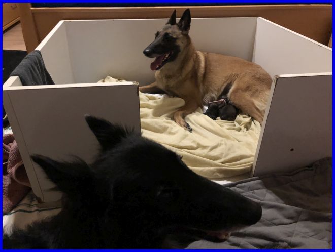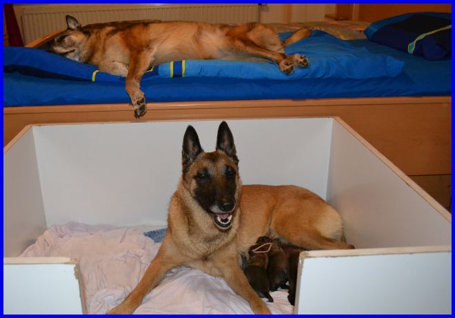 Akela und Frl. Rot. Das fand Akela dann doch nicht so gut, wollte ihre Babys alle sofort wieder in die Wurfkiste tragen.