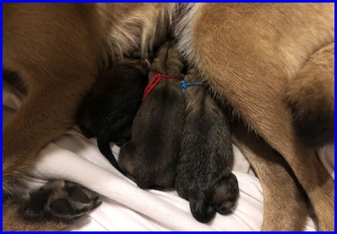 Am 02.08.2019 setzten die Wehen ein und die Geburt meines O-Wurfes begann. In genau drei Stunden brachte Akela sechs gesunde und putzmuntere Welpen zur Welt. Nach zwei Mädels kam der erste Bub zur Welt, und nach dem nächsten Mädchen purzelten dann noch zwei weitere hübsche Buben in unsere Wurfkiste. Somit hat uns Akela dieses Mal drei wunderschöne Paare geschenkt. Akela und den Babys geht es sehr gut, die kleinen "O-hrwürmchen" entwickeln sich prächtig, haben schon am ersten Tag zugenommen.