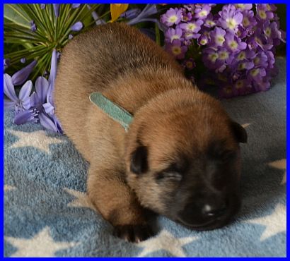 Der zweite Rüde, Mr. Grün, war der schwerste Welpe, aber Frl. Rot hat ihn überholt! Er wiegt jetzt genauso viel wie Frl. Lila: