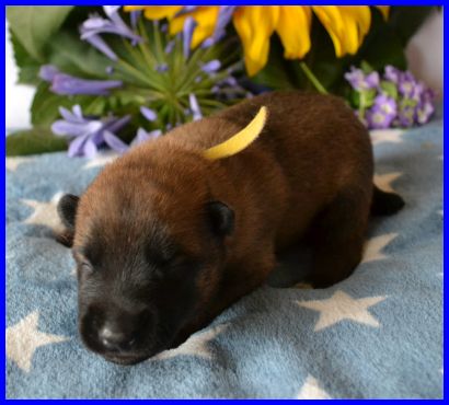 Der zweite Welpe, wieder eine Hündin, ist der Leichteste Welpe, sie war aber auch die Hündin mit dem niedrigsten Geburtsgewicht. Sie wiegt jetzt: