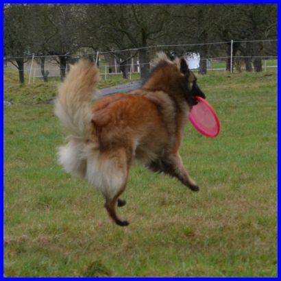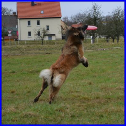 Die nachfolgenden Fotos zeigen Farouche beim Frisbee spielen, das liebt sie besonders! Sie spielt unwahrscheinlich gerne Frisbee, da zeigt sie wie viel Feuer in ihr steckt! Farouche ist enorm schnell und besitzt eine hohe Sprungkraft. Leider habe ich bei uns nicht die Möglichkeit unter professioneller Anleitung mit ihr Frisbee zu trainieren, deshalb spielen wir "just for fun"! Ich habe mit Farouche im Obedience in Klasse 1 mehrere Prüfungen mit Vorzüglich abgelegt. Nun trainieren wir für die Klasse 2! Während der Tragezeit und der Aufzuchtzeit der Welpen ist der Hundeplatz natürlich tabu, deshalb können wir erst im Herbst die nächsten Prüfungen in Angriff nehmen.