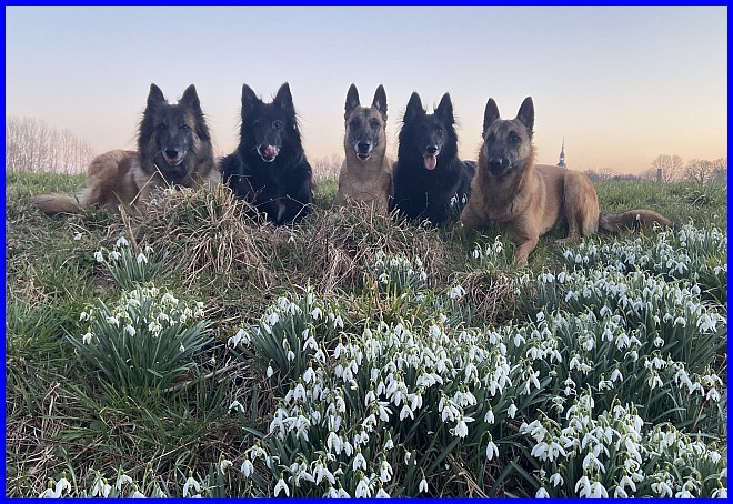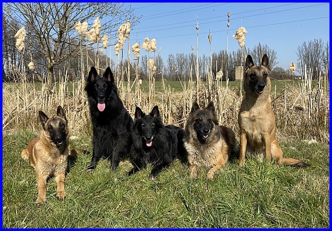 Die nachfolgenden Fotos sind vom13.3.2022 es ist der 45. Tag der Trächtigkeit. Meine Mädels, von links nach rechts: Tervuerendame Farouche, Oma Yoopee, Malidame Akela, die schwangere Viktoria und rechts außen Teenie Mali Quintana