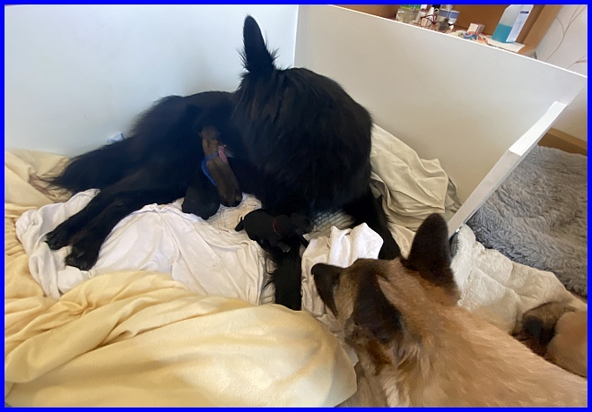 Nach zwei Stunden Pause kam Baby Nr. 4, der 3. Rüde, an. Akela durfte sogar mit putzen, so schön!!! Ihre Mama YooPee durfte nicht mit ins Schlafzimmer, das hat mich sehr überrascht, denn die Beiden haben eine sehr innige Beziehung. Viktoria wird anscheinend wirklich erwachsen.