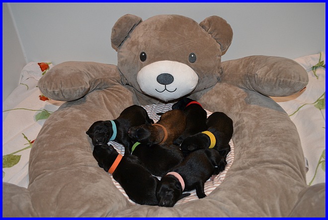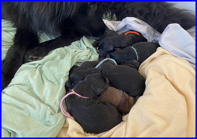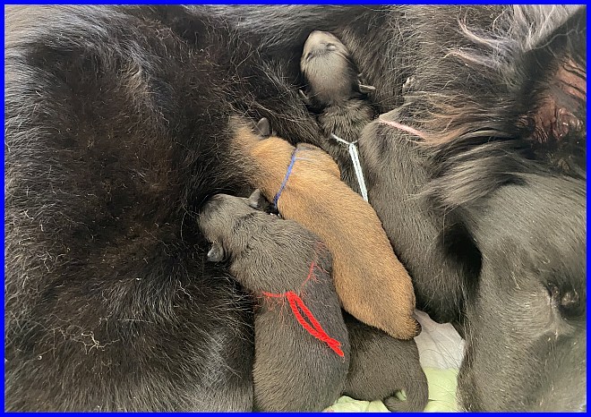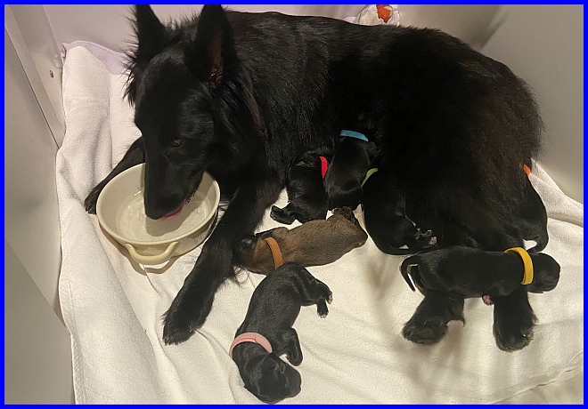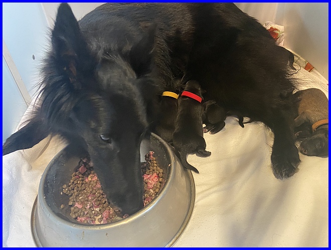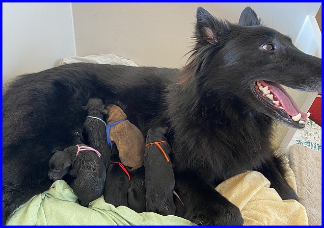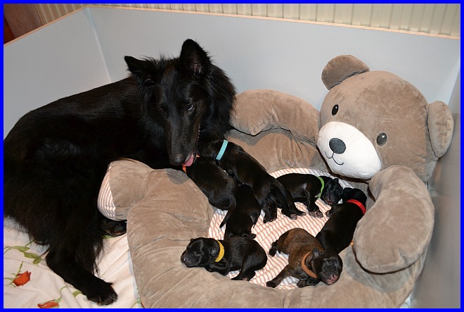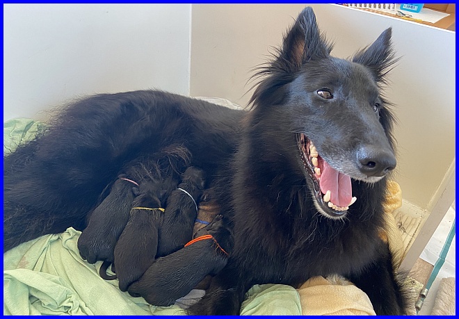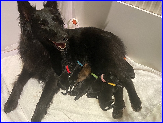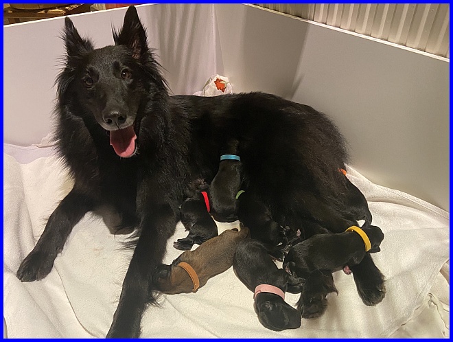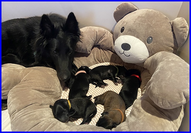 Am 29.03.2022 setzten die Wehen ein und die Geburt meines R-Wurfes begann. In genau vier Stunden und 35 Minuten brachte Viktoria sieben gesunde und putzmuntere Welpen zur Welt. Es war der 61. Tag der Trächtigkeit, die Welpen haben sehr gute Gewichte. Der erste Welpe war ein hübscher Tervueren Rüde, der leider auch der einzige Tervuere geblieben ist. Leider hat uns Vicky kein Tervueren Mädchen geschenkt, sie wäre zu Hause geblieben. Es purzelten dann noch vier Groenendael Rüden und zwei Groenendael Hündinnen in unsere Wurfkiste, somit hat uns Vicky fünf hübsche Prinzen und zwei wunderschöne kleine Prinzessinnen geschenkt. Vicky und den Babys geht es sehr gut, die kleinen "Rohdiamanten" entwickeln sich prächtig, haben schon am ersten Tag zugenommen.