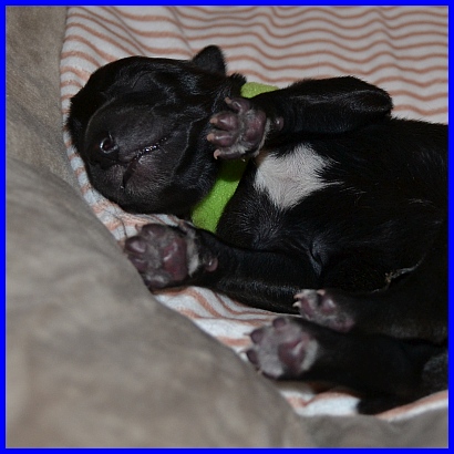 Der erste Welpe, der kleine Tervuere, es ging so plötzlich los, damit hatte ich nicht gerechnet. Vicky hat ihn in ihrem zweiten bevorzugten Wurfplatz, dem Kissen unter der Treppe im Haus, geworfen. Sie hat alles alleine gemacht. Ich war einerseits erschrocken, weil die Geburt schon los ging, andererseits war ich total stolz, sie hat alle Instinkte einer guten Hündin gezeigt!!!