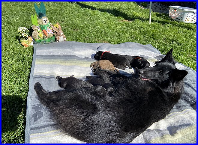 Für das Osterbild durften Rüde Blau und mein Tervuerenrüde ein wenig posieren, sie waren noch nicht so müde wie ihre Geschwister. |