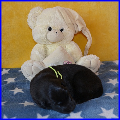 Nach dem Fotoshooting gab es dann lecker Milch von Mama, das war schon sehr anstrengend für die Welpen. Raus aus ihrer vertrauten Umgebung, der Wurfkiste, und dann auch noch ganz alleine ohne Geschwister und Mama, und dann die vielen neuen Gerüche... Das war wirklich anstrengend, und in fünf Minuten ist das auch nicht erledigt!