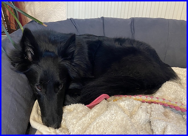 Zuhause hat sie sich sofort ins Körbchen gelegt...sieht sie nicht aus als wenn sie schmollen würde? Ich bin aber auch soooo gemein, jetzt ist der Bauch nackig, kalt und die gute Figur ist auch bald futsch...böse Züchtermama ;-)