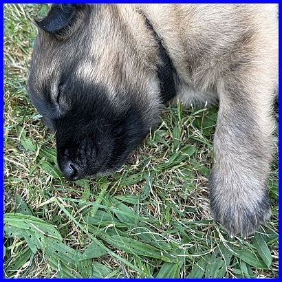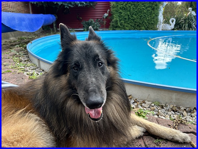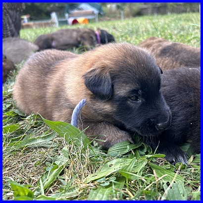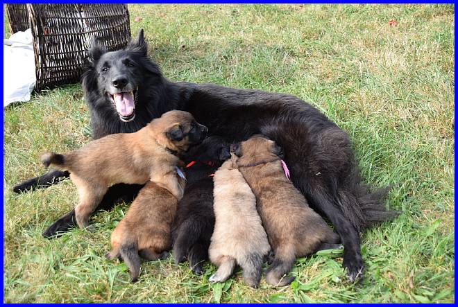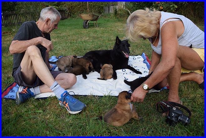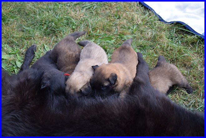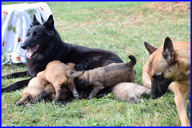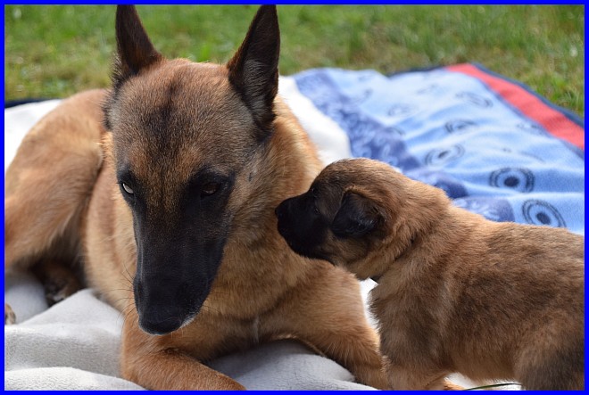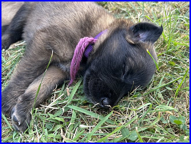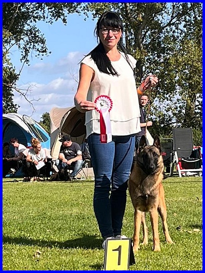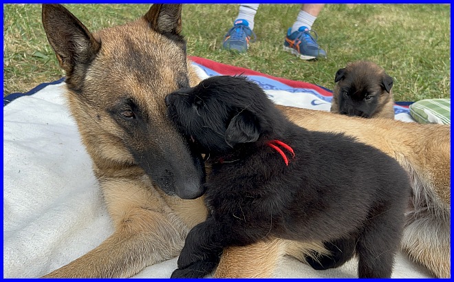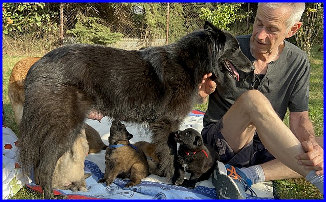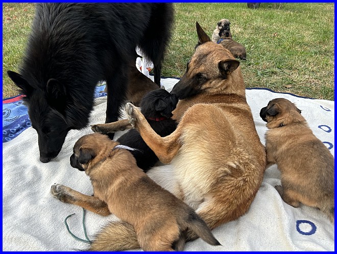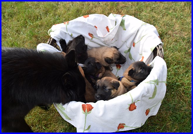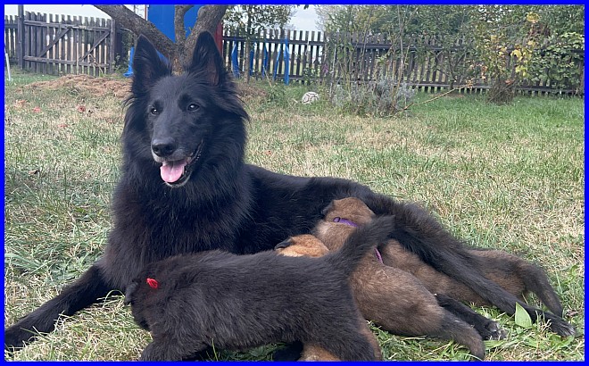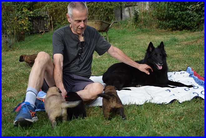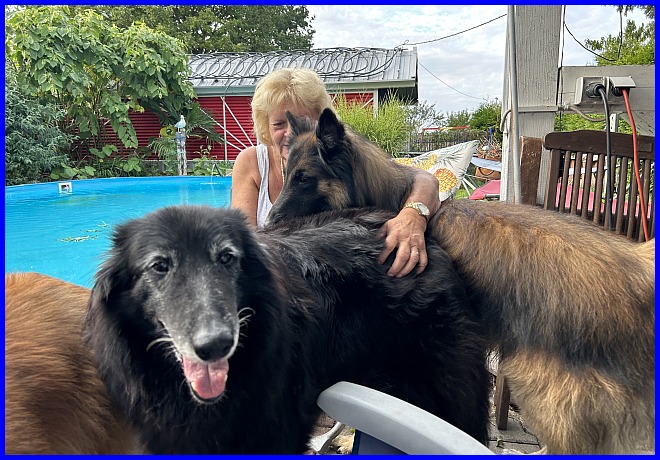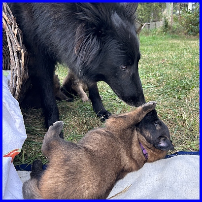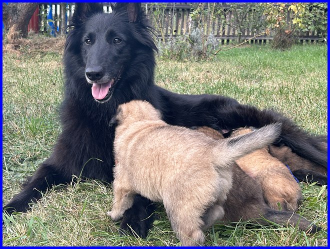 Am 29.09. und 30.09.2023 hatten wir Besuch von Micha und Moni mit ihren Tervueren Rüden Finn und Gobi. Sie wollten nach Kulkwitz zur DKBS Speziale und haben das mit einem Besuch bei uns verbunden. Für die Babys war das der erste Kontakt mit fremden Menschen, sie zeigten sich sehr offen und neugierig, sind gerade mal 3 Wochen und 2 Tage alt. Quintana hatte ich auch für die Ausstellung gemeldet. Leider war ich krank und konnte nicht mit nach Kulkwitz fahren, aber Moni und Micha haben Quintana mitgenommen. Micha hat sie im Ring geführt und mit ihr ein V2 bekommen, danke Micha, ich habe mich sehr darüber gefreut!!! Gobi, Sohn von meinem Finn, hat den 4. Platz mit Vorzüglich erhalten, herzlichen Glückwunsch. Leider gibt es kein Bild von Gobi, sehr schade.