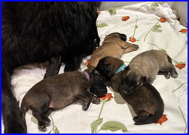 Am 13.09.2023 waren meine kleinen Superstars schon eine Woche auf der Welt, hatten 1. Woche Geburtstag. Klar mussten da Fotos gemacht werden! Es war zwar einen Tag später, alle Aufnahmen sind vom 14.09.2023, aber das ist schon noch ok ;-)Viktoria ihre Babys entwickeln sich prächtig. Natürlich verbringen sie die meiste Zeit mit schlafen und trinken, es passiert noch nicht viel in der Wurfkiste. Frl. Rot, das kleine Gröni Mädchen, hatte pünktlich zum 1. Woche Geburtstag als Erste ihr Geburtsgewicht verdoppelt, einen Tag später hatten dann die beiden Rüden ihr Geburtsgewicht verdoppelt, und noch einen Tag später hatten die Tervueren Mädchen ebenfalls verdoppelt. Es ist Viktoria ihr zweiter Wurf und sie zeigt sich wieder als eine sehr entspannte, liebevolle und super vorbildliche Mutter. Sie versorgt die Babys sehr gut, lässt sie nur zum Lösen alleine. Und sie ist sehr wachsam, keiner meiner anderen Hunde darf bis jetzt zu den Welpen. Aus unserer "Menschenfamilie" darf jeder zu den Babys, selbst meine kleinen Enkelkinder, das freut mich besonders sehr. Die Welpen erleben von Anfang an Kinder, so wie Kinder nun mal sind - manchmal laut und auch leise, schnell und wieder langsam in ihren Bewegungen... eben Kinder! In meinem nächsten Beitrag werde ich einige Fotos mit meinen Enkelchen zeigen, es ist einfach nur wunderschön zu sehen, wie lieb Henry mit den Babys ist und wie sehr uns Viktoria vertraut.