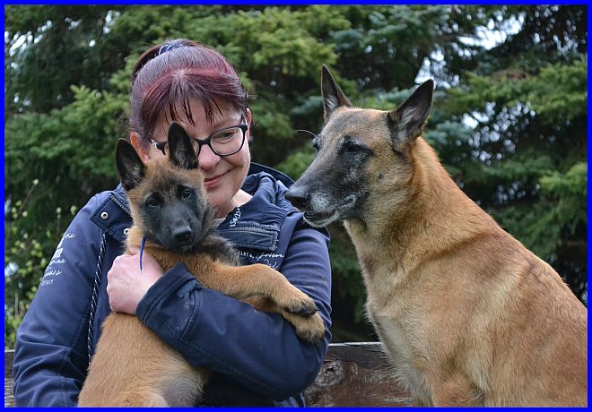 Mr. Grün - Samson Salomon Jr. of the beautiful black one - SASA gerufen, ist vergeben. Er wohnt bei Jörg, Anja und Sally in Bad Liebenzell. Shadow, Ines und Annette ihr Groenendael, sollte auch mit aufs Bild. Aber Akelei duldete das überhaupt nicht, näher durfte Shadow nicht ans Baby und Ines ran.