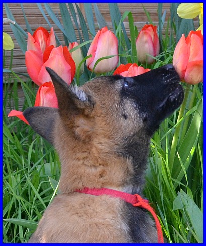 Sooo süß, sie wollte die Tulpen probieren, aber wir wollten doch alle Welpen vor diesen schönen Tulpen präsentieren... also war schnüffeln erlaubt, fressen nicht :-) |