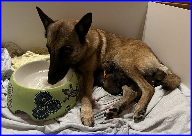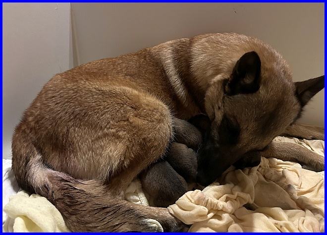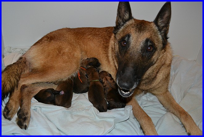 Ein wenig kann man den Bauch erkennen, ich hätte nie gedacht, dass Quintana sechs Welpen bekommt. Zugenommen hat sie gerade mal 4kg, ich habe mit höchstens 5 Welpen gerechnet.