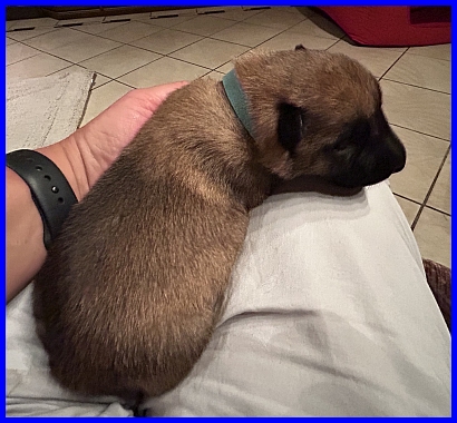 Mr. Grün, der Zweitegeborene, wiegt 780g und ist zusammmen mit Mr. Grau der leichteste Welpe zur Zeit. Er hatte mit 351g das niedrigste Geburtsgewicht und sein Bruder, Rüde Grau, war ja auch nur 8g schwerer. |