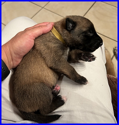 Rüde Gelb hat sein Geburtsgewicht als Erster schon am 28.08. verdoppelt, wiegt 891g und ist damit auch der schwerste Welpe zur Zeit. Er hatte mit 365g nur 3g weniger Geburtsgewicht als sein Bruder, Rüde Orange. |