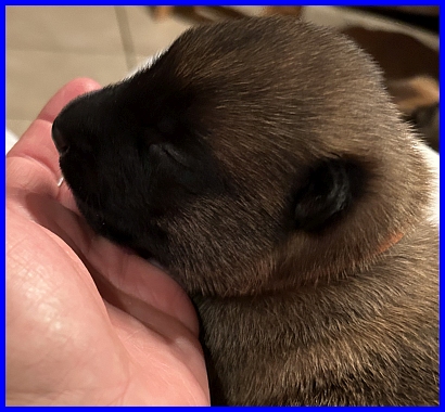Mr. Grau wiegt 780g und ist zusammen mit Mr. Grün der leichteste Welpe. Aber auch er hat pünktlich zum 1.Woche Geburtstag, auf das Gramm genau (718g), verdoppelt :-) |