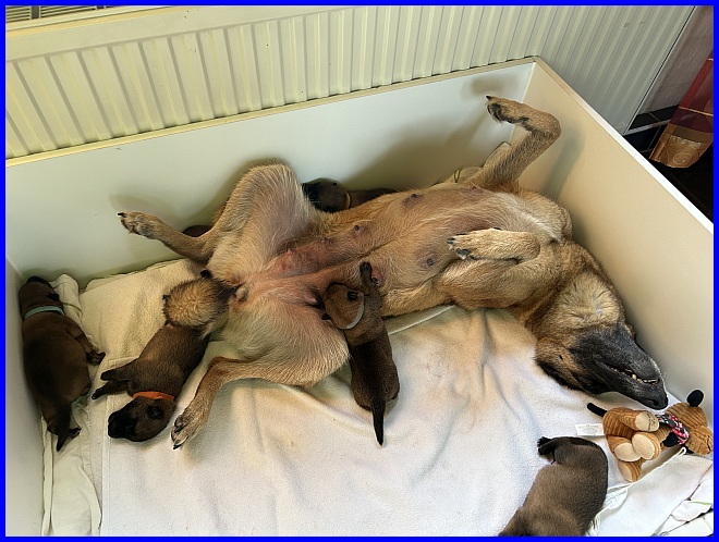 Das war das allerletzte Foto und dann durfte Quintana endlich entspannt schlafen. Es ist für jede Hündin sehr anstrengend, wenn der Züchter mit den Welpen Fotos machen möchte. Die Knirpse gehören eigentlich naturgemäß in ihre Höhle, hier bei uns Menschen in die Wurfkiste. Und da waren sie nun endlich wieder, alles ist gut, bis zum nächsten Fototermin :-)