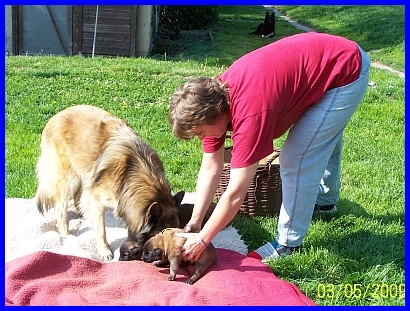 Frauke aus Berlin ist zu Besuch und bringt, von Abbi eskortiert, die Babys auf die Wiese. |