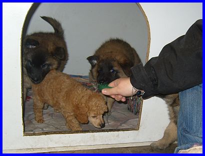 Avanti ist einfach nur traumhaft! Sie spielt absolut lieb mit den Welpen, gibt ihnen das Gefühl die Stärksten zu sein. Sie macht sich ganz klein und läßt sich besiegen, ich könnte stundenlang zusehen! |