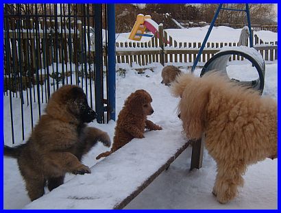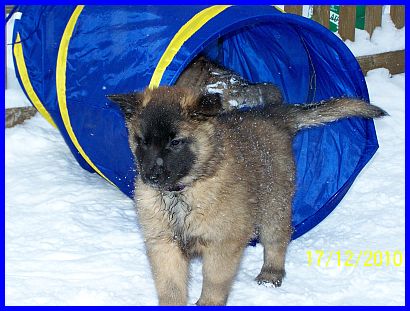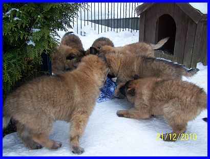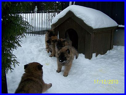 Die letzten zwei Wochen sind wie im Flug vergangen! Die Welpen sind noch schneller gewachsen, haben ein enormes Selbstbewußtsein entwickelt und finden das Herumtollen im Schnee einfach nur klasse. Jetzt dürfen sie auch zeitweise in den großen Garten, das ist natürlich Abenteuer pur. Da gibt es unwahrscheinlich viel zu entdecken. Besonders toll finden sie natürlich die vielen Verstecke, ob es nun die Höhle unter den Koniferen ist oder hinter einem riesen Haufen Schnee, die Möglichkeiten sind nahezu unbegrenzt, wenn man so klein ist;-)