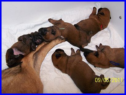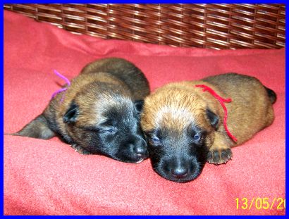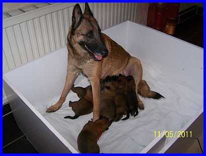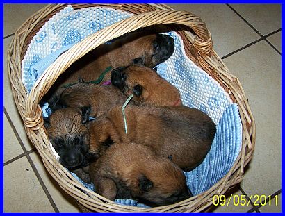 14 Tagen, die sie nun schon auf der Welt sind, enorm entwickelt. Aus blinden und tauben Saugwelpen haben sich kleine Hunde entwickelt, die langsam die ersten tapsigen Schritte versuchen. Einen riesen Schritt in der Entwicklung gab es vom 10. bis zum 14. Lebenstag der Welpen. Das kann man auch sehr gut auf den nachfolgenden Fotos sehen. Mit 10 Tagen (09.05.2011) sind die Welpen noch recht unbeholfen, die Augen und auch die Ohren sind noch geschlossen, die kleine Welt besteht zum größten Teil immer noch aus trinken und schlafen. Schon einen Tag später versuchen die Babys sich aufzusetzen, auch wenn es nur ganz kurz und ziemlich wakelig ist. Mit 13Tagen (12.05.2011) sind bei allen Welpen die Augen geöffnet, sie nehmen eindeutig Schatten wahr, reagieren auf Bewegungen vor ihren Augen. Sie versuchen die ersten richtigen Schritte, fallen natürlich nach zwei bis drei Schritten auf die kleinen Nasen, aber sie versuchen ihr Glück immer wieder aufs Neue! Einen Tag später, mit 14 Tagen (13.05.2011), sind sie schon etwas sicherer in ihren Bewegungen und machen es mir nicht gerade leicht, gute Fotos zu schießen. Ständig läuft einer aus dem Bild ;-) Die Babys untersuchen schon recht neugierig ihre Geschwister, versuchen mit dem kleinen noch zahnlosen Mäulchen einander festzuhalten. Sie haben auch ihre Stimmen entdeckt. Ab und zu kann man schon kleine Knurrlaute aus der Wurfkiste hören! Sie sind jetzt auch in der Lage sich selbstständig zu lösen.