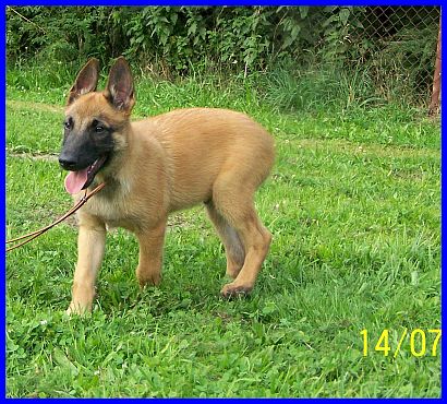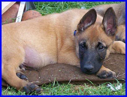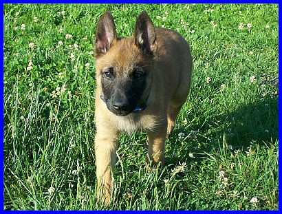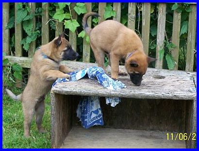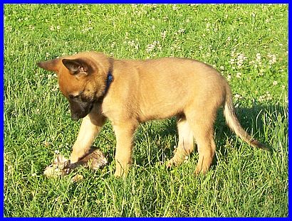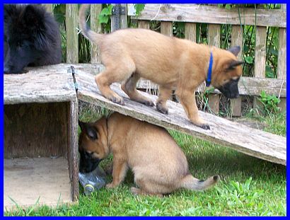 Auf den nachfolgenden Fotos sehen sie Einar, den Einzelkämpfer! Einar ist ein lebhafter, sehr sportlicher junger Rüde. Er ist neugierig und für jede Art von Sport und Spiel zu begeistern. Unerschrocken hat er jedes neue Spielzeug erkundet und erobert. Auf der Schaukel zu stehen, sich von den anderen Welpen drehen und schaukeln zu lassen, macht Einar besonders viel Spaß. Dabei hat er ein ernorm gutes Körpergefühl entwickelt. Einar, wie auch El Bundy, sind sehr liebe, freundliche und gut sozialisierte junge Malinois. Durch unser großes Hunderudel kennen sie schon Junghunde, meine fünf Monate alte Grönihündin Yoopee und den sieben Monate alten Kleinpudelrüden Edward meiner Tochter, erwachsene Belgier und Pudel, und aber auch schon Kleinpudelwelpen. Da meine Tochter zur Zeit einen Wurf Kleinpudel hat, haben die Malinoiswelpen gelernt, wie man mit kleinen Welpen spielt, ohne diesen weh zu tun. Sie passen perfekt als Zweithunde zu Familien auch mit kleineren Hunden. Generell wünsche ich mir für beide eine Familie, die schon einen Hund hat, da sich beide durch unser großes Rudel (insgesamt vier Belgier und fünf Pudel) hervorragend in ein neues Rudel einfügen und damit auch bestimmt sehr glücklich werden würden. Als Einzelhunde hätten sie es in der Anfangszeit sicherlich etwas schwer, aber auch daran gewöhnt sich ein junger Hund sehr schnell. Auf jeden Fall würden sie es sicher sehr genießen, plötzlich "der Mittelpunkt" der neuen Familie zu sein.