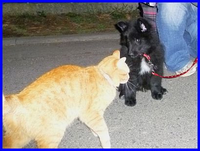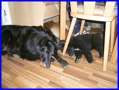 Abigail ist etwas beleidigt und eifersüchtig, aber sie ist ja auch ein bischen "mein Liebling"! Sie ist aus meinem A-Wurf, der erste Welpe, dem ich auf die Welt geholfen und behalten habe, sie ist für mich einfach etwas besonderes. Obwohl ich sie sicher nicht bevorzuge, weiß sie doch genau, wie sie mich mit ihrem Charme um den kleinen Finger wickeln kann. Aber sie ist trotzdem nett zu Yoopee und versucht auch schon mit ihr zu spielen, nur kuscheln darf sie noch nicht mit Abbi.