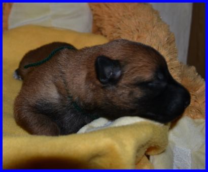 Der leichteste Welpe, ein kleiner Rüde, hat seinen Bruder "blaues Band" fast eingeholt, er wiegt nur 2g weniger: