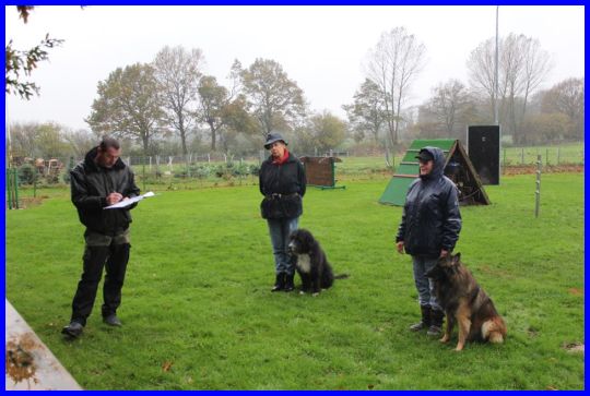 Bei Dauerregen musste ich meine Prüfung machen, das war nicht so prickelnd aber wir, meine Chefin und ich, haben es bestens gemeistert. Unsere Gruppe bestand aus 3 Paaren. Unser Partnerteam bestand aus Frauke mit ihrem Hannes, der mich auch noch vorher an gegrummelt hat-Frechheit sowas. Aber das bringt mich ja nun überhaupt nicht aus der Ruhe und ich absolvierte mit Moni die Strecke problemlos, das war natürlich auch in der Freifolge der Fall. Sonst, im Training, bin ich in der Ablage ja immer wieder mal aufgestanden und meine Chefin hatte auch damit gerechnet. Nee nee, ich wusste ja wie wichtig die Prüfung ist und bin vorbildlich im Platz geblieben. Moni hat nicht schlecht gestaunt, Ja jaaa ich kann es doch wenn ich denn auch will. Leider gibt es nicht viele Bilder aber die Wenigen zeige ich euch gerne.