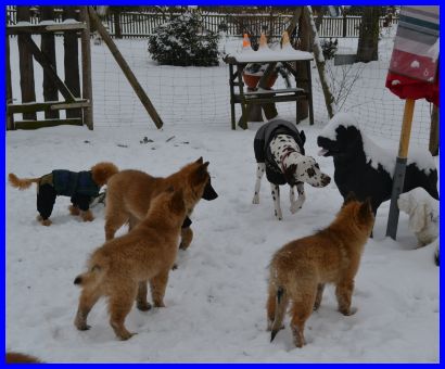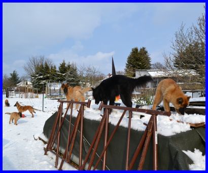 Filippa, die Sportskanone, mußte natürlich auf diesen Stapel Baumaterial rauf! Sofort sind die anderen auch hoch geklettert, aber Yoopee hat auf ihre Welpen aufgepaßt und ihnen gezeigt, dass man vorne ganz gut runterrutschen kann. Und schon wieder haben die Welpen einen neuen Spielplatz entdeckt, die Rutsche war klasse, solange Schnee drauf lag! |